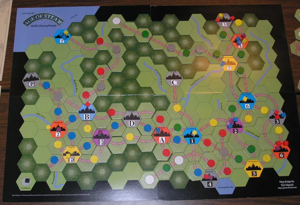 This Age of Steam Expansion expands the game to 1830's Pennsylvania and Northern California. 1830's Pennsylvania: This Age of Steam expansion takes place in 1830’s Pennsylvania, as the industrial revolution began, and the demand for coal to power locomot