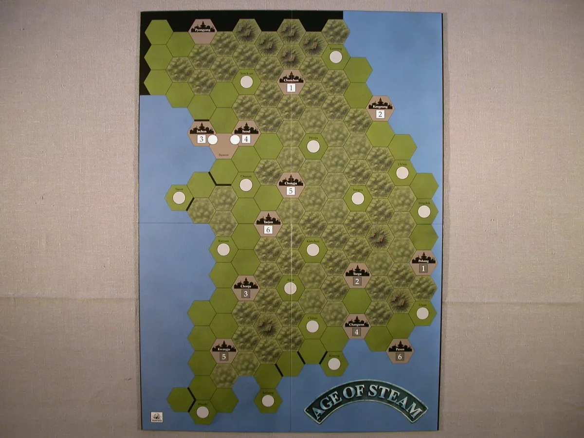 This Age of Steam Expansion #3 contains a two-sided board with Scandinavia and Korea. The Scandinavia map adds sea routes and an extra action "Ferry" which allows transport from one coastal city to another. In Korea, none of the cities are colored, i.e. no
