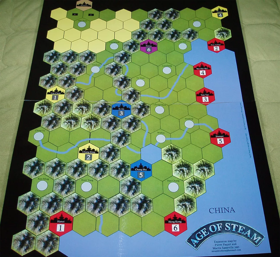 Age of Steam: Mexico & China is an exciting new expansion for the Age of Steam board game series. These are mounted hardboard maps. The Mexico Map – originally released by the Steam Brothers as part of AoS: Mexico, Spain/Portugal – features a new speci