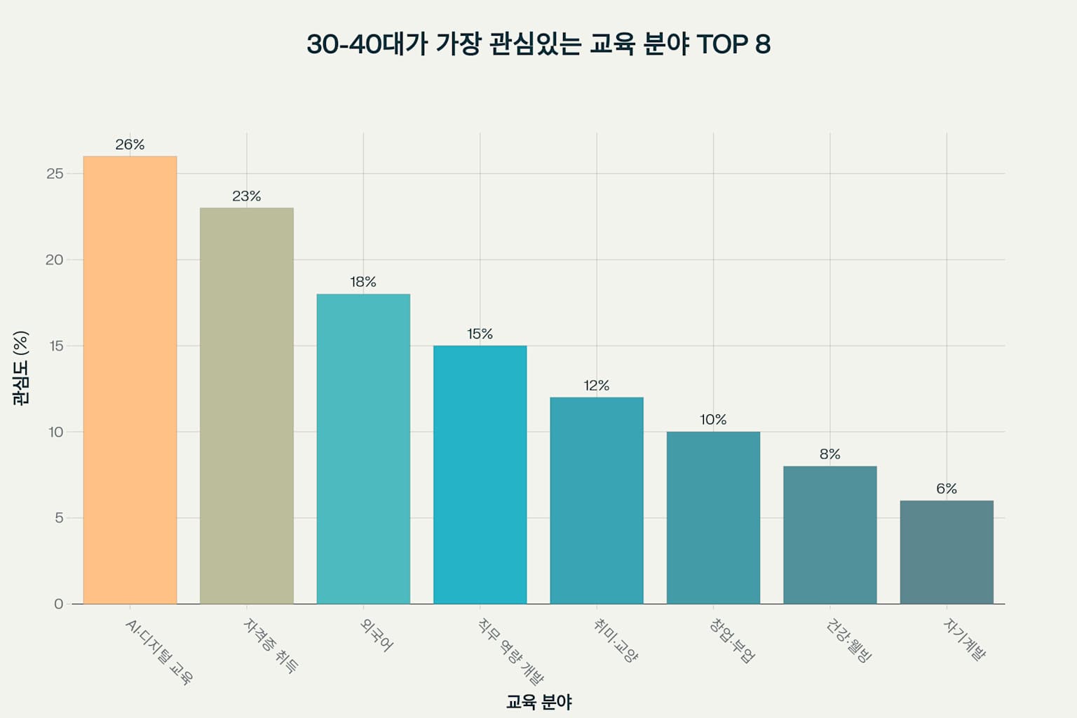 30-40대는 인생의 전환점에서 새로운 역량 개발에 대한 욕구가 가장 높은 시기입니다. 특히 AI·디지털 교육에 대한 관심이 26%로 가장 높고, 자격증 취득(23%), 외국어(18%) 순으로 나타나고 있습니다.