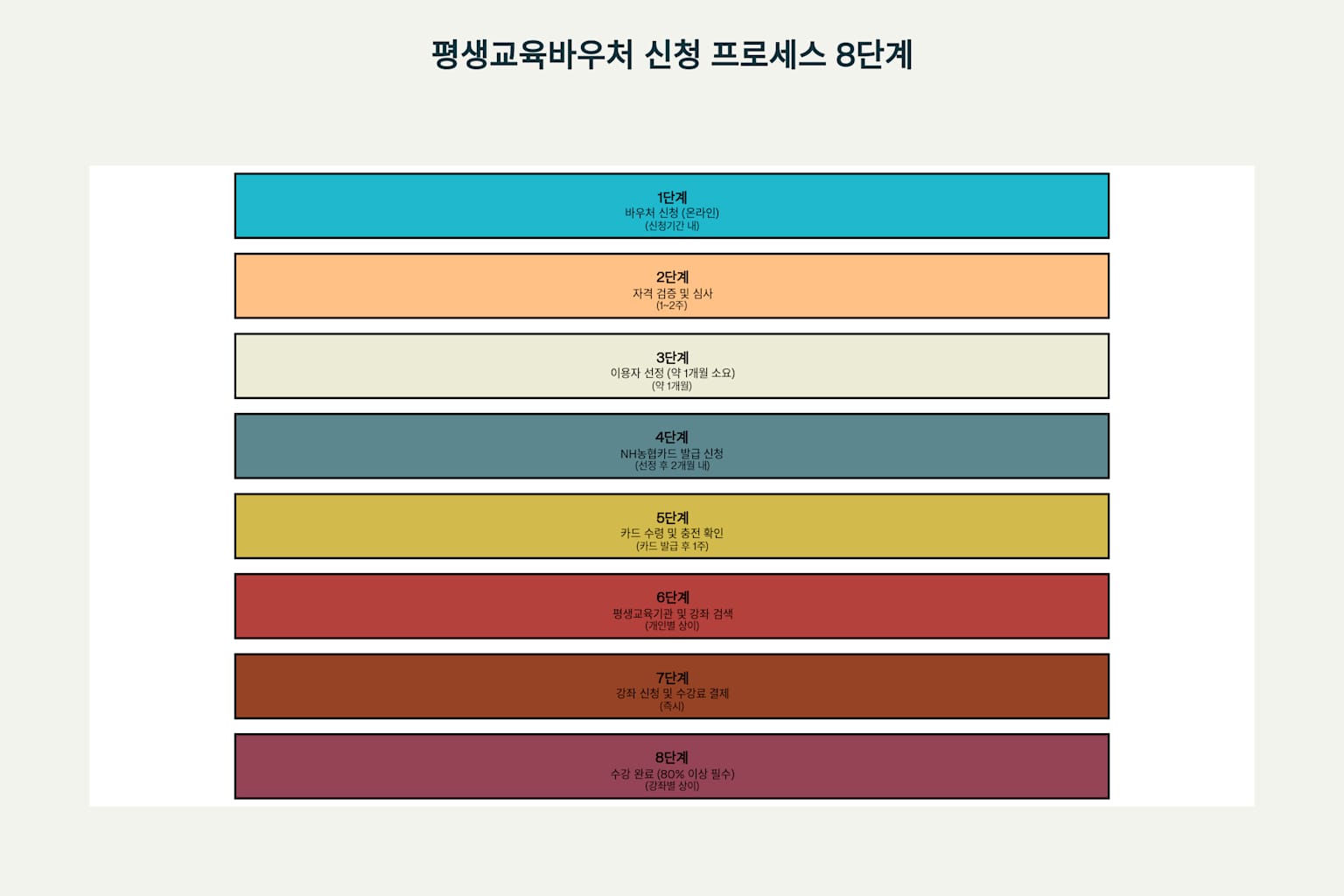 평생교육바우처 신청은 온라인으로만 가능하며, 8단계의 체계적인 프로세스를 거칩니다.